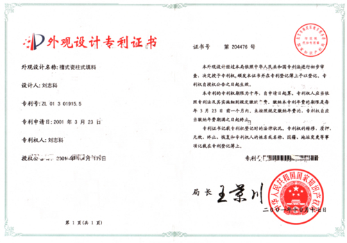 • 槽式瓷柱填料专利证书