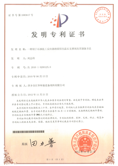 • 镁铝尖晶石支撑剂自主产权发明专利证书