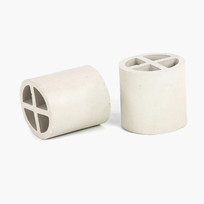 陶瓷十字隔板环填料是基于增加填料的比表面积,从而强化传质效率而开发出来的。 其形状是在拉西环中间增设了十字隔板。 一般来讲,这种填料由于尺寸较大,仅适用于整体堆彻,目前一般只作为乱堆填料的塔底支撑分布层用。