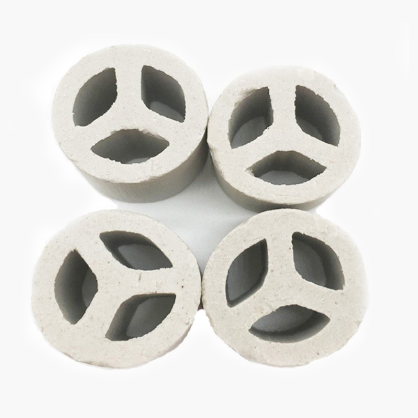 陶瓷三丫环填料是一种经外观独特设计加工成的一种新型高效散堆填料,产品高径比约为2:1,内部设有一个或三个“Y”型隔板,这样增大比表面积,提高了汽液分散性能,使汽液接触更充分。三丫环填料是从阶梯环、共钜环、扁环、矩鞍环的基础上以及在形状、外观和结构综合考虑,进行取长补短而改进的。