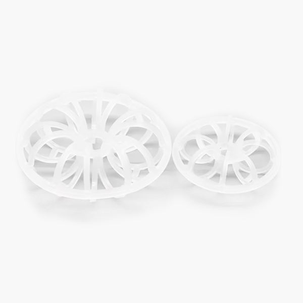 塑料花环填料也称梅花环填料,泰勒花环填料,污水处理花环填料等,该填料是由许多圆环结绕而成,就像双圆花环,具有抗压强度高,填料之间相互重叠小、比表面积大、流体阻力压降小,能耗低、操作费用低、重量轻、易装卸、可重复使用,塔内不易堵塞,分离效果好,使用寿命长。